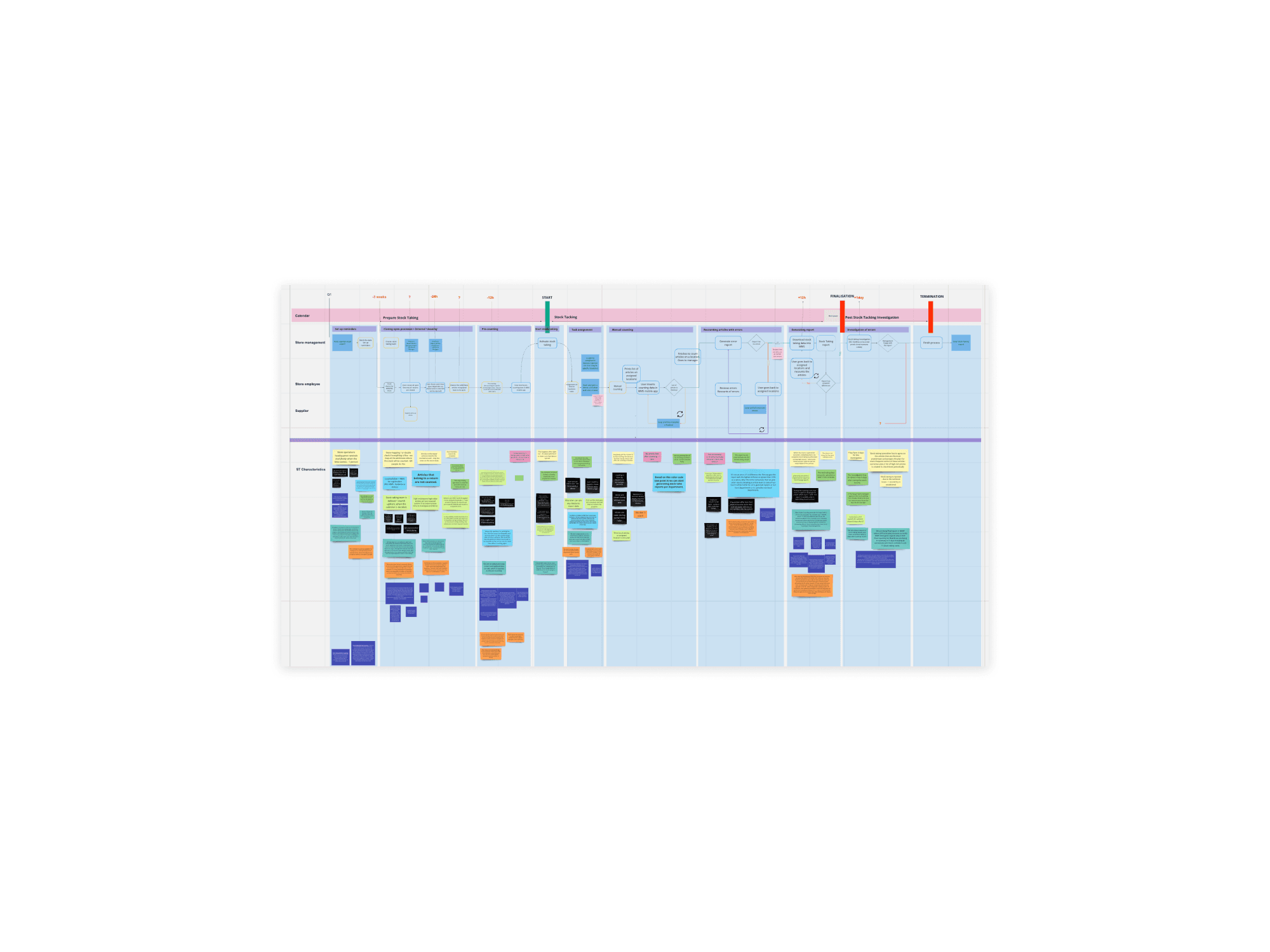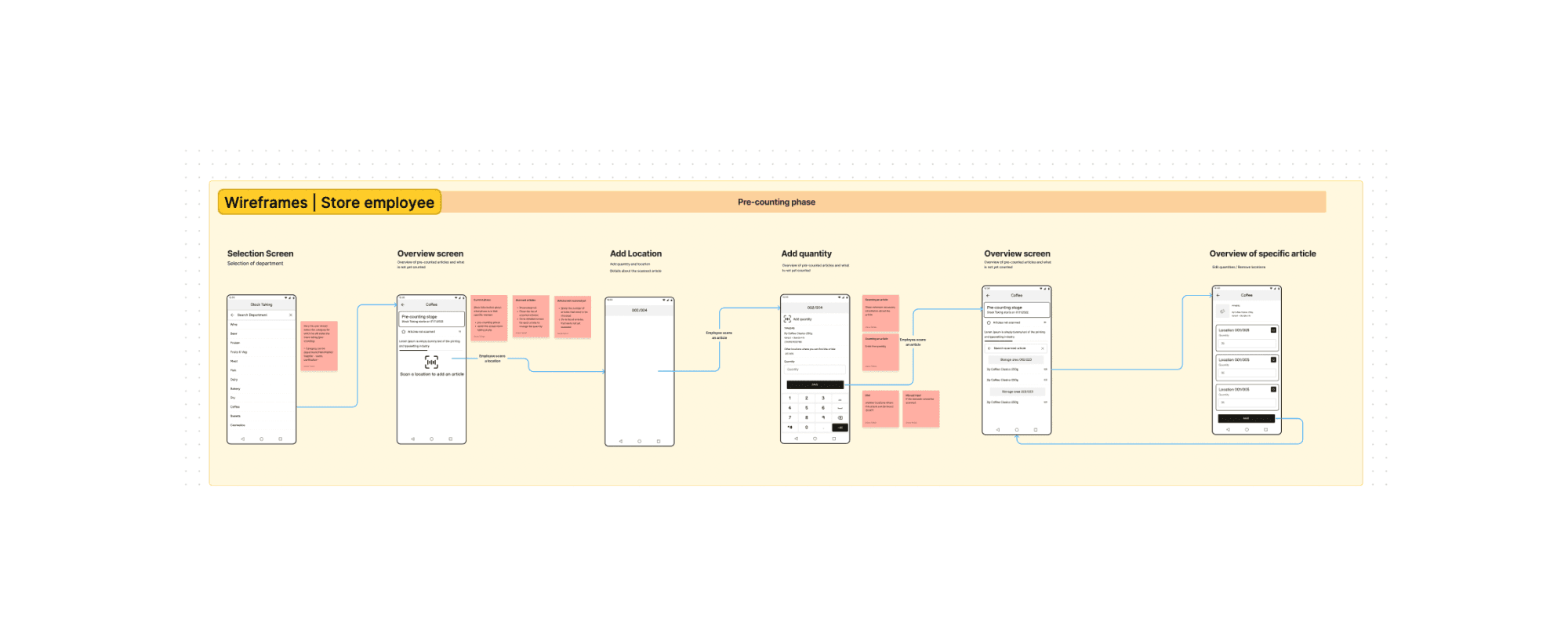 Before starting our research inside METRO store, we gathered all stakeholders in a series of discovery workshops to gain insights and additional details regarding the problem. We also conducted a field study to understand the inventory process for insect repellents. We learnted that junior staff counted the items, noted quantities on post-its, and a supervisor later entered the data using a handheld device. A report highlighted discrepancies for corrective actions. The study validated our assumptions, uncovered unknown practices, and provided actionable insights.